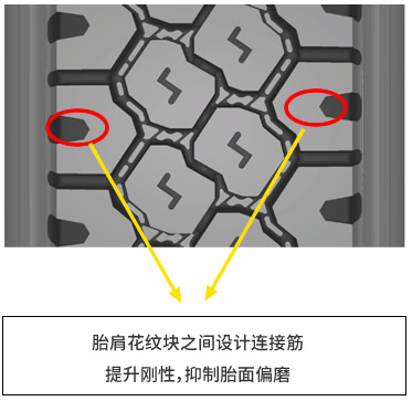 ■ ? 胎肩花紋塊之間設(shè)置連接筋,提升胎面整體剛性抑制胎面偏磨;