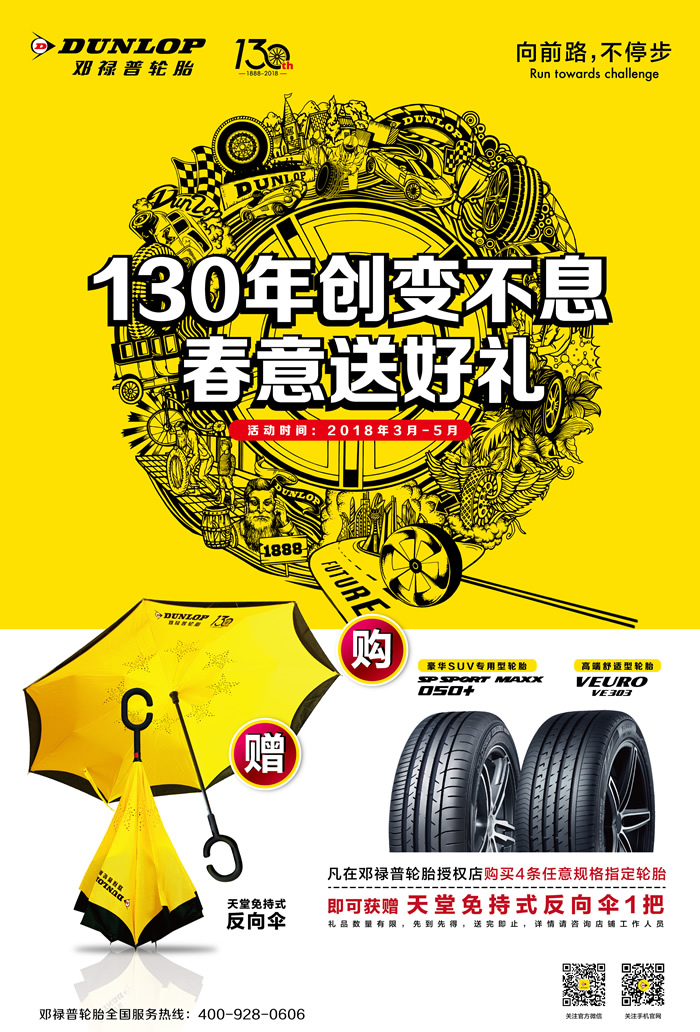 值此130周年慶典之際,為了回饋廣大車主對鄧祿普的厚愛與支持,鄧祿普將在全國范圍內(nèi)推出“春意送好禮”促銷活動:2018年3月至5月,消費者前往鄧祿普指定門店購買4條SP SPORT MAXX 050+或VEURO VE303輪胎,即可獲贈印有紀(jì)念LOGO的定制版天堂免持式反向傘,無論風(fēng)雨,鄧祿普都將與車主一路相伴。